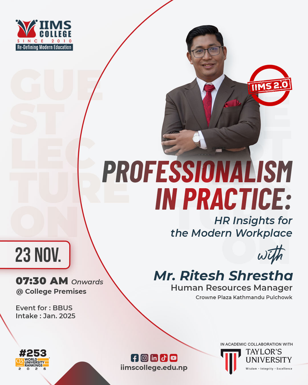 Our BBUS January 2025 students are all set to participate in an exciting session on “Professionalism in Practice” on 23rd November 2025. The session will be led by Mr. Ritesh Shrestha, HR Manager at Crowne Plaza Kathmandu.