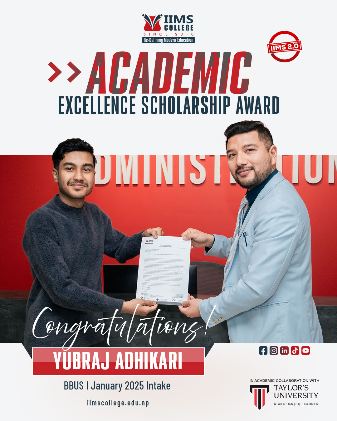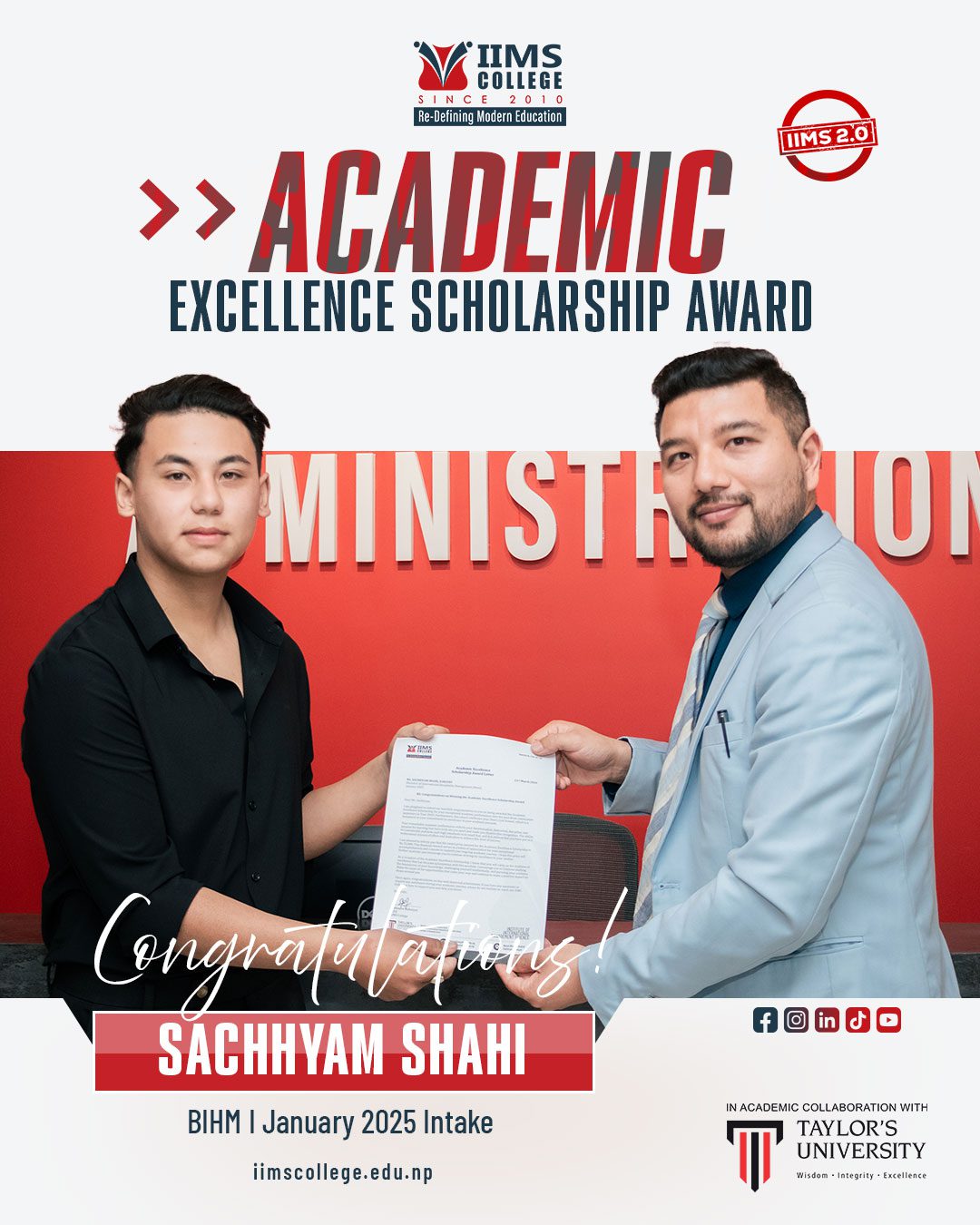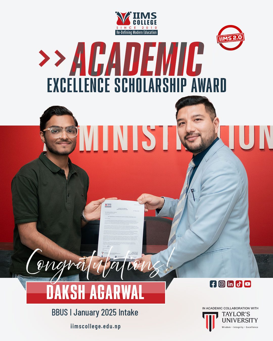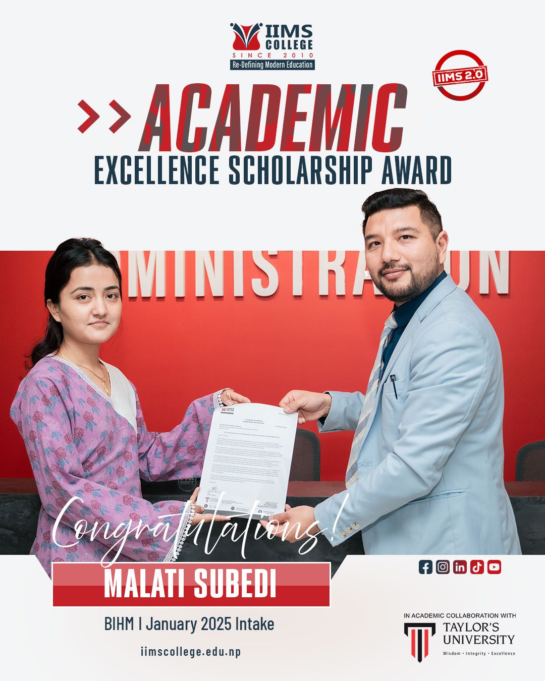 IIMS College is proud to recognize and celebrate the outstanding achievements of its students who have been awarded the Academic Excellence Scholarship Award. This honor reflects their dedication, perseverance and strong commitment to academic excellence.