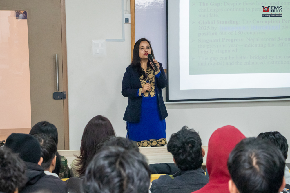 An insightful session led by Ms. Sangita Subedi, Section Officer of the Government of Nepal at the High Court of Patan, focused on the role of technology and ethics in combating corruption. The session helped students understand how digital tools, combined with strong ethical values, can promote transparency and accountability.